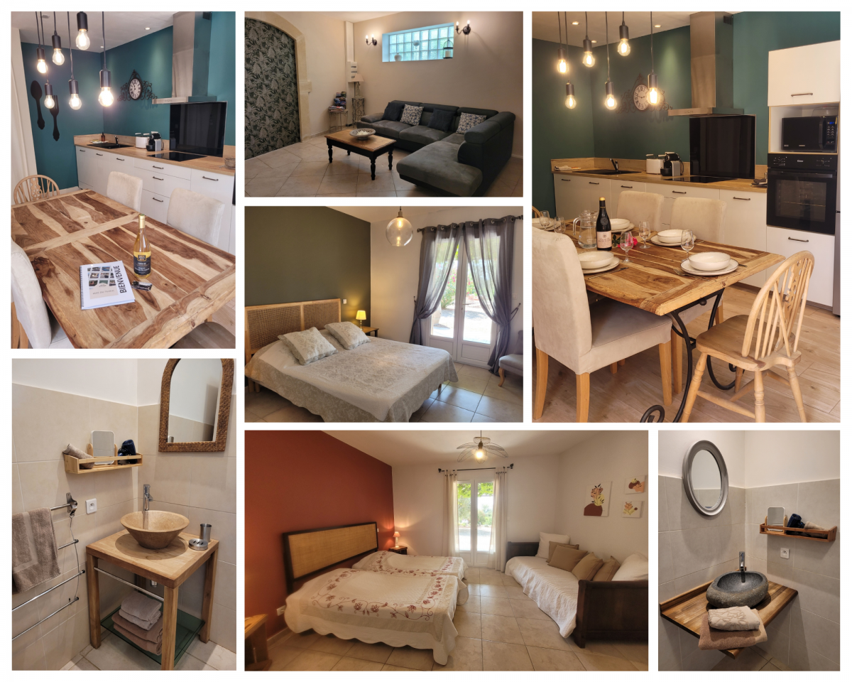 Ce gîte de charme mêle tradition et confort moderne : Salon lumineux avec décoration élégante, cuisine équipée ( lave vaisselle, lave linge, four, micro onde, plaque vitrocéramique, réfrigérateur/congélateur, nespresso, grille pain), salle à manger, deux chambres cosy ( un grand lit en 160cm pour l'une et trois lits de 90 cm pour l'autre ) , deux salles de bains modernes avec douche à l’italienne